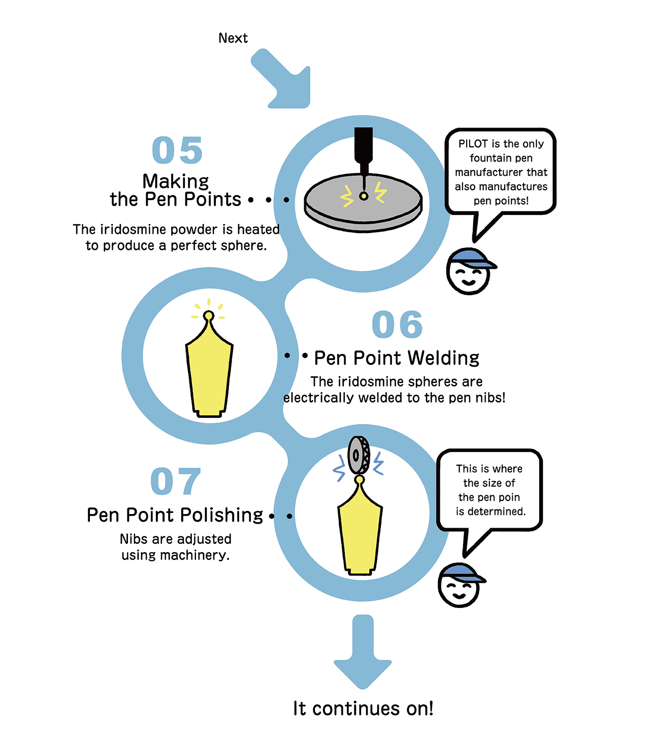 PILOT manufactures not only the nibs themselves but also the small spherical pen points at the tip of the nibs.
