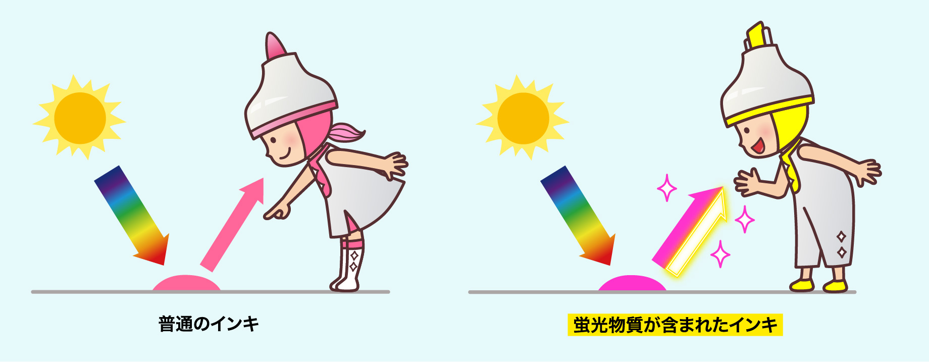 蛍光物質は、目に見えない紫外線という光をエネルギーとして吸収し、目に見えるキラキラした光に変えて出します。蛍光ペンはこの蛍光物質をインキに使っているため、光を受けている間だけ光って見えますが、光がなくなると発光は止まります。そのため、暗いところでは光っては見えません。