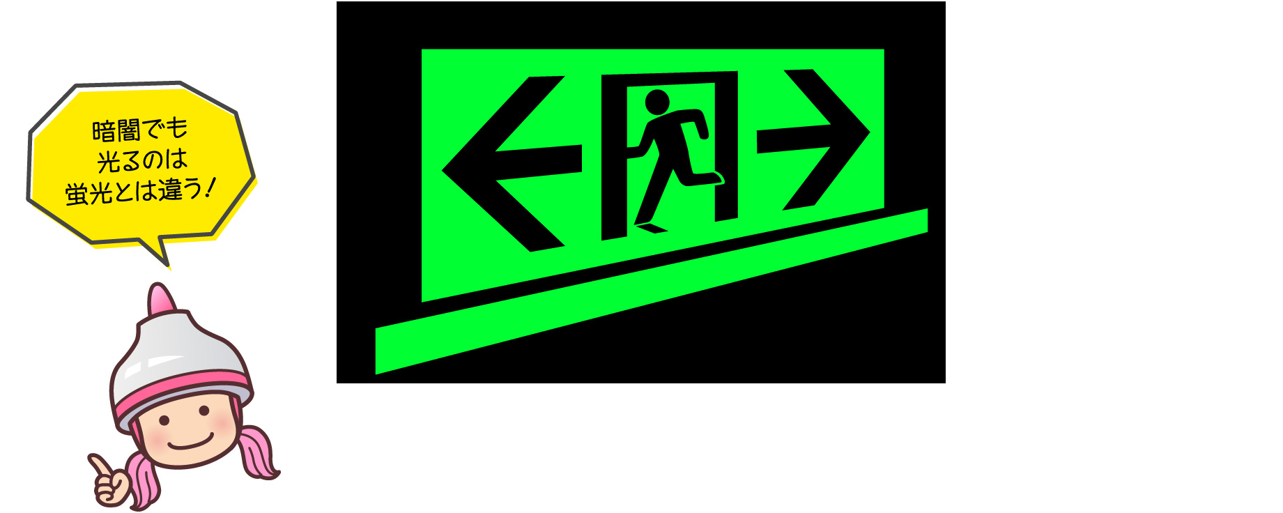 「蛍光」は光がある間だけキラキラと光り、鮮やかな色に見えるため、蛍光ペンや、標識・看板などにも利用されています。一方、「蓄光」は蓄えたエネルギーが少なくなってくると光は弱まりますが、再び光を当てれば蓄光を繰り返します。暗闇で光るため、防災用品や誘導するための標識などに利用されています。