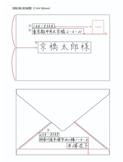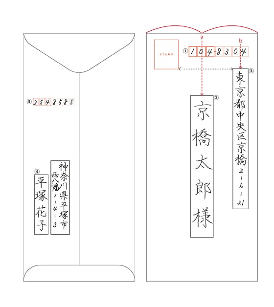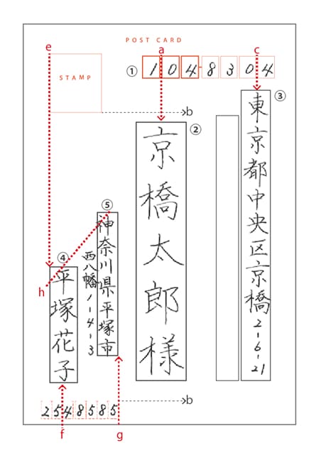 切手の下のライン(b) が文字の下ラインになるように配置し、住所の書き出しは郵便番号と揃えて書き出します。横書きの場合は、番地等の数字を全て算用数字に。