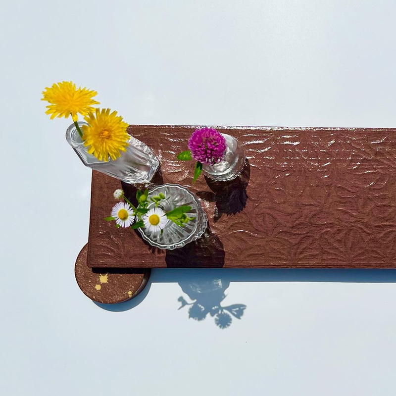 韓国の伝統技法「韓紙工芸」をベースに、和紙や韓紙を組み合わせてアートパネルやインテリア雑貨を制作しています。現在力を入れているのは、オリジナル文様「花影」を用いた作品。花びらのようにも波のようにも見える文様を厚紙に描き、切り絵の要領で切り出してパネルに貼り、その上に和紙や韓紙を重ねることで、レリーフのように文様が浮かび上がる表現に仕上げています。今後は、この技法をランプやお盆、タンスなどのインテリアにも応用していきたいと考えています。