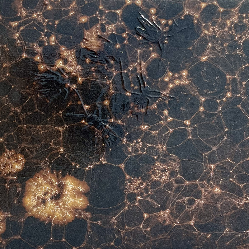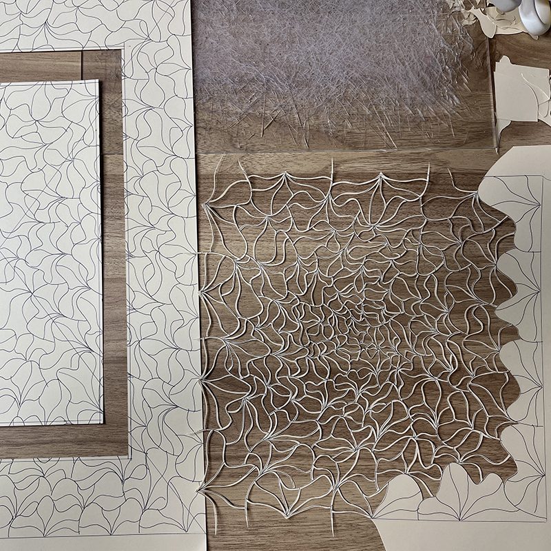photoトップメイン:オリジナル文様「花影」を施し、韓紙にアクリル絵の具と漂白剤を混ぜたものを散らした作品。 photo1:「花影」と漂白剤でスパッタリングをしたパーツを合わせたトレー。 photo2:美しいと感じたものを書き留めたアイデアスケッチ。 photo3:文様を厚紙に描き、切り絵の要領で切り出していく。 photo4:M25号サイズの作品の下書き作業。 photo5:塵を食べるチャタテムシをモチーフとした作品。