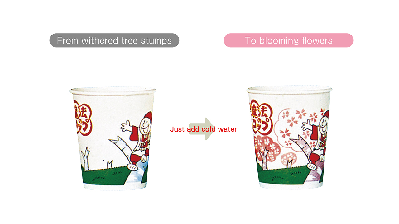 After gaining the patent in 1975, we launched the Magic Cup in 1976, the world’s first paper cup using Metamo Color, which changed color when cold water was added.