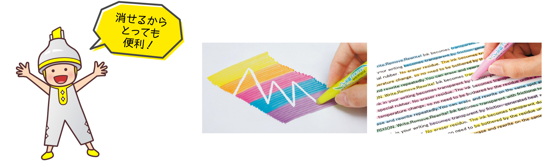こすったときの摩擦熱で筆跡のインキを無色にするため、消しゴムで消す筆記具と違って消しカスが出ず、鉛筆やシャープペンシルの消し跡に比べると消し残りが少ないのも特長です。