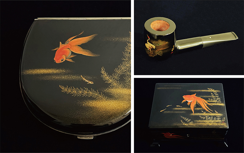 大正末期から昭和の時代に作られた「ペンスタンド」は、金魚の蒔絵を施したものや螺鈿のきらびやかさなど、蒔絵の世界を楽しんでいただけます。当時は海外向けの商品として、輸出されていました。