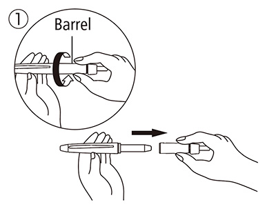 First, ensure that the nib is retracted. Then, rotate the barrel in the direction of the arrow to remove it.