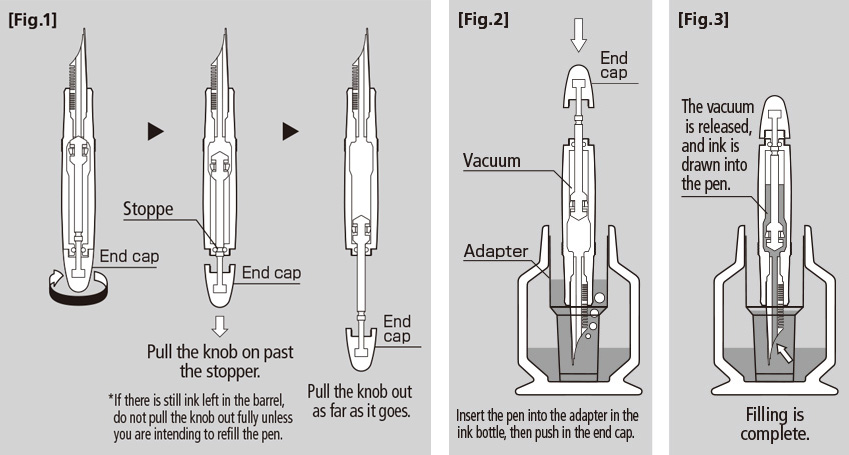 Hold the pen upright and push the knob back in. A vacuum is created, and ink is sucked into the pen as the knob is returned. [Fig.3]