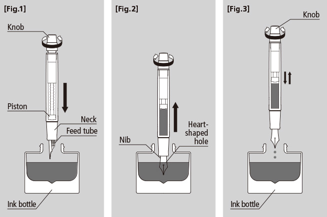 Immerse the nib in the ink until its heart-shaped hole is covered and slowly twist the knob clockwise until it stops to draw ink into the pen. (Repeat this step two or three times when the feed tube is dry.) [Fig.2]
