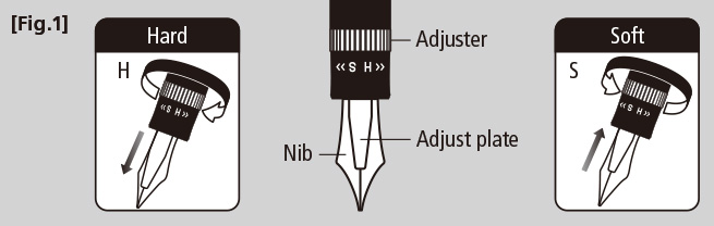 Twist the Adjuster to the mark "H," the pen touch becomes harder, or to the mark "S," it becomes softer. [Fig.1]
