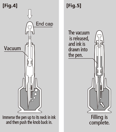 Hold the pen upright and push the knob back in. A vacuum is created, and ink is sucked into the pen as the knob is returned. [Fig.5]