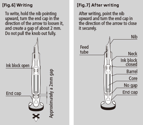• After writing, hold the nib pointing upward and slowly turn the end cap screw in the direction of the arrow until it is fully closed. [Fig.7]