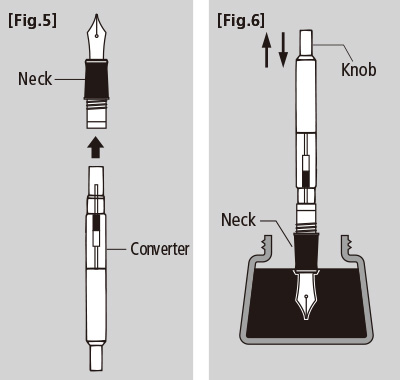 While holding the neck with the nib pointing up, unscrew the neck from the pen barrel and then insert the converter firmly. [Fig.5]