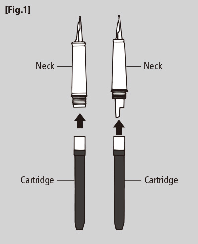 Insert a new cartridge. Please insert the cartridge straight in. Twisting it during insertion may prevent the valve from opening.[Fig.1]